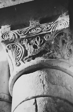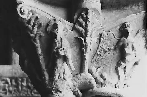Bild 23 Carennac (Lot): Voluten und Lichtort auf dem Kämpferstein. Unter den Volutenorten, je verteilt auf beide dort aneinanderstoßende Kapitellfläche, je aus zwei Hälften „zusammengesetzte”, quasi vollständige Physis-Schemata. Zwischen ihnen ein nach links springendes, hundeartig-monströses Tier, dessen aufgerichteter Schweif am Lichtort in einem Dreiblatt endet. Ein weiteres Dreiblatt entwächst (entströmt als Atem) seinem Maul.